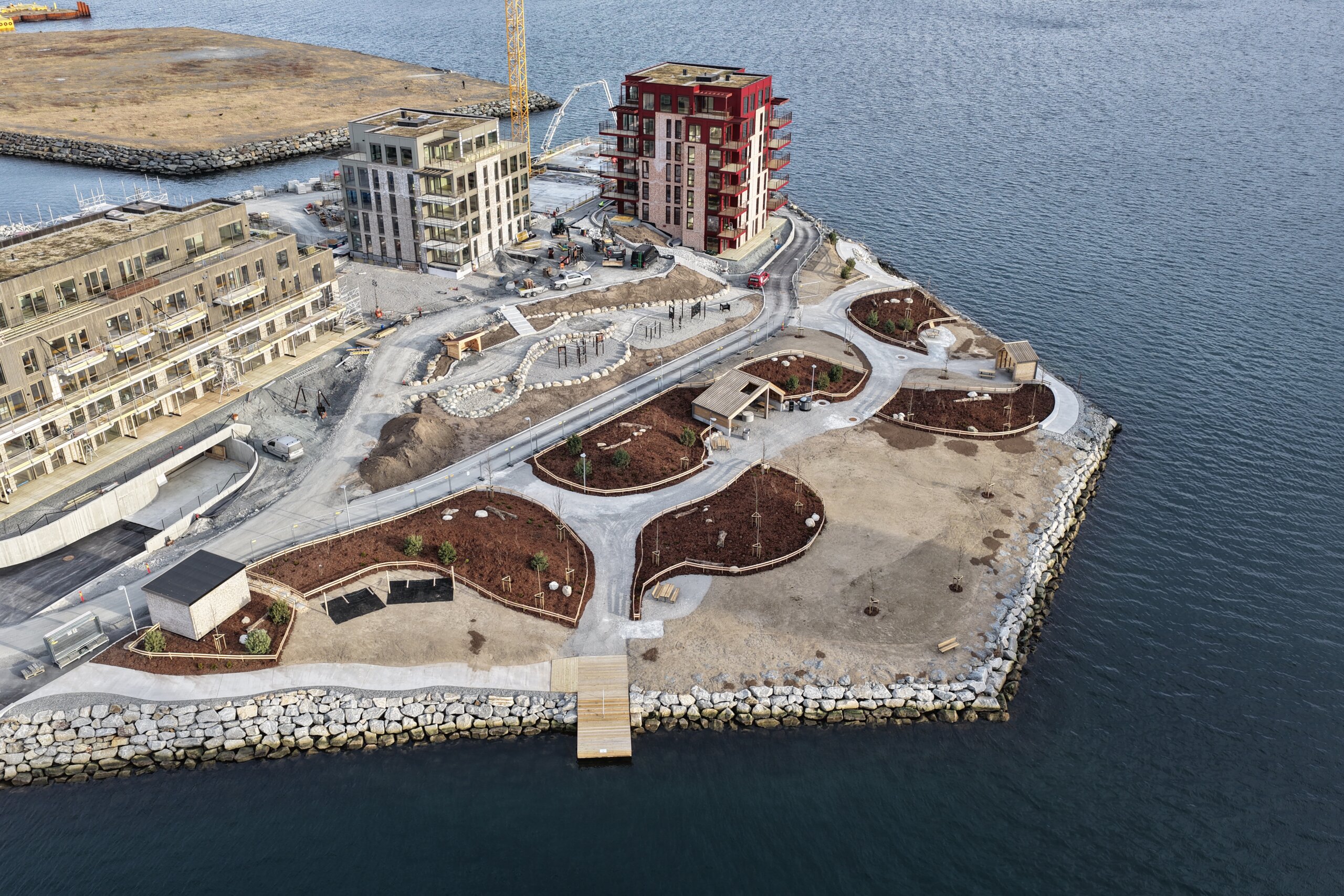 Vi legger ledninger for vann og avløp, strøm, fiber, fjernvarme og fjernkjøling. Vi bygger et fint torg med gode oppholdssoner og plantefelt og vi bygger ny park, Fjordparken, helt sør-øst i området. I parken blir det både gapahauk, et naust, en brygge, benker og bord og mye grønt – et trivelig sted å være.